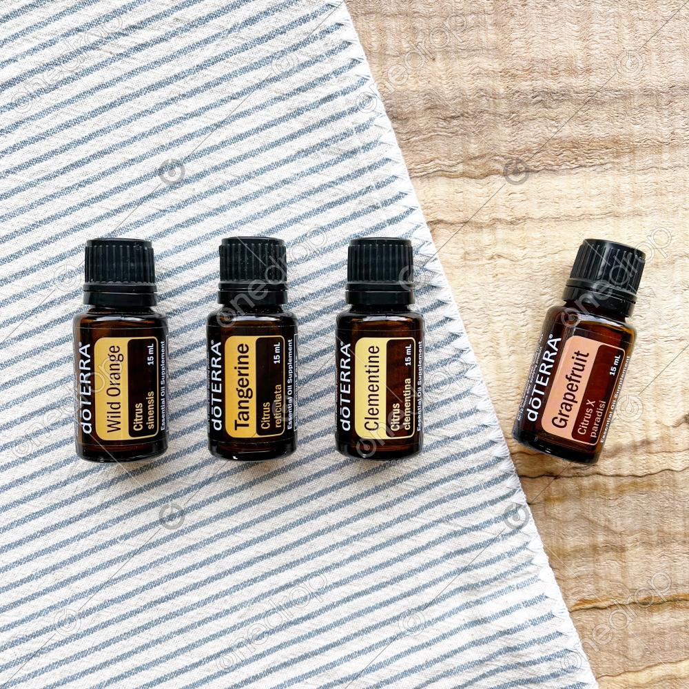 Lemon/Eucalyptus, Roman Chamomile, dōTERRA Wild Orange, Tangerine, Clementine & Grapefruit in a Flat Lay - 3 images