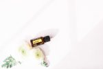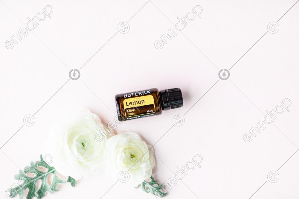 15 ml Lemon Oil on pink background with white flowers and leaves. Blank space can be used to add text or high resolution image can be cropped creatively for Instagram, Facebook, or social media.