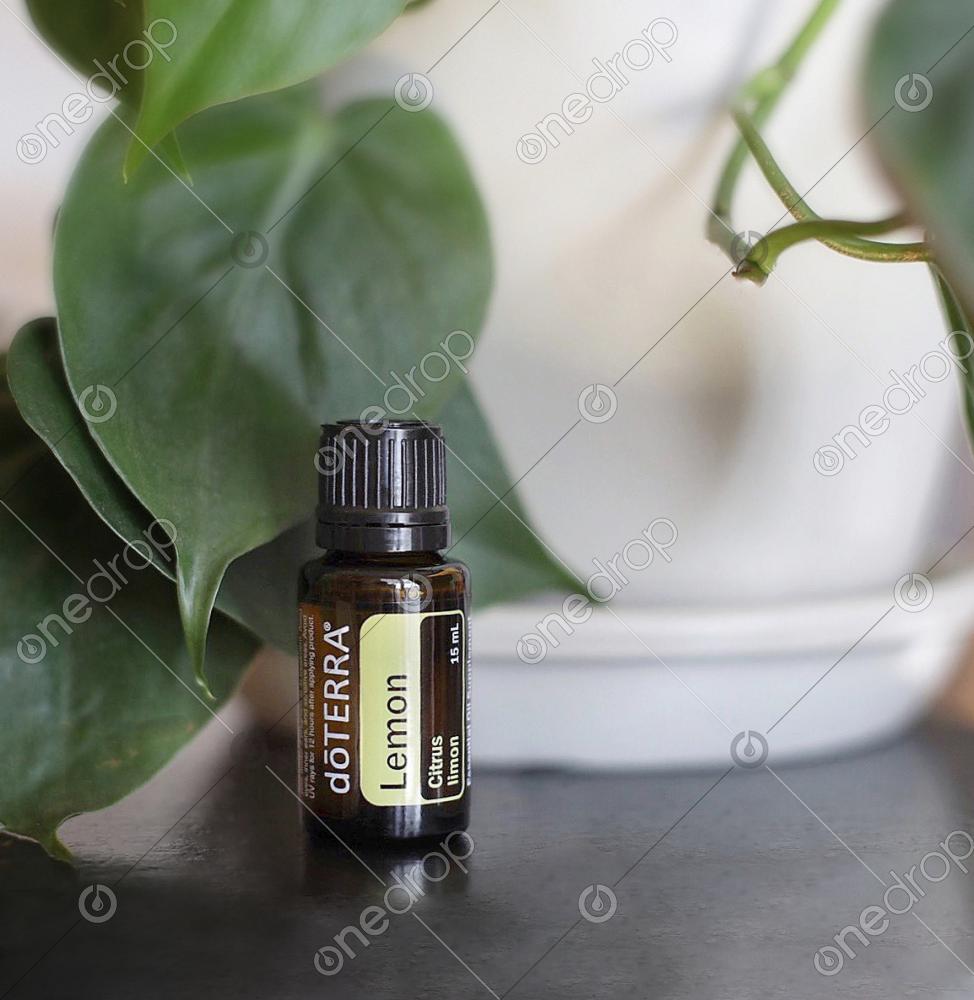 A 15ml bottle of Lemon essential oil on a black table in front of a plant. Negative space to add text for social media or advertising.