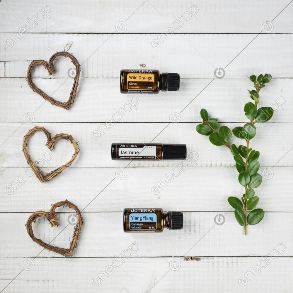 Libido Booster Oils - Jasmine, Ylang Ylang and dōTERRA Wild Orange Flat lay on white wood with greenery