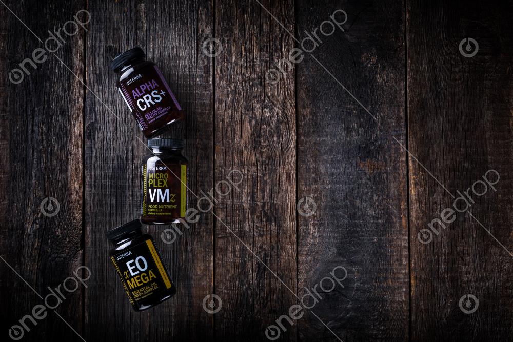 supplements flat layout on dark wooden background, copy space for text