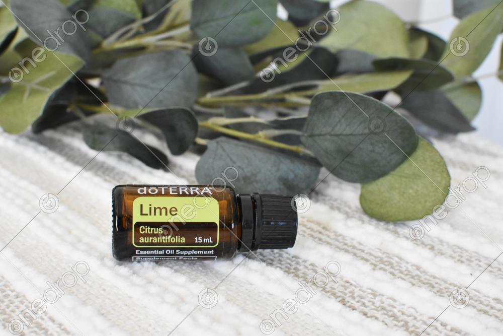 15 mL Lime Essential Oil with greenery and textured cream background