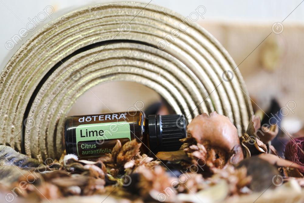igh resolution image of Lime essential oil nestled in dried flowers with gold rainbow