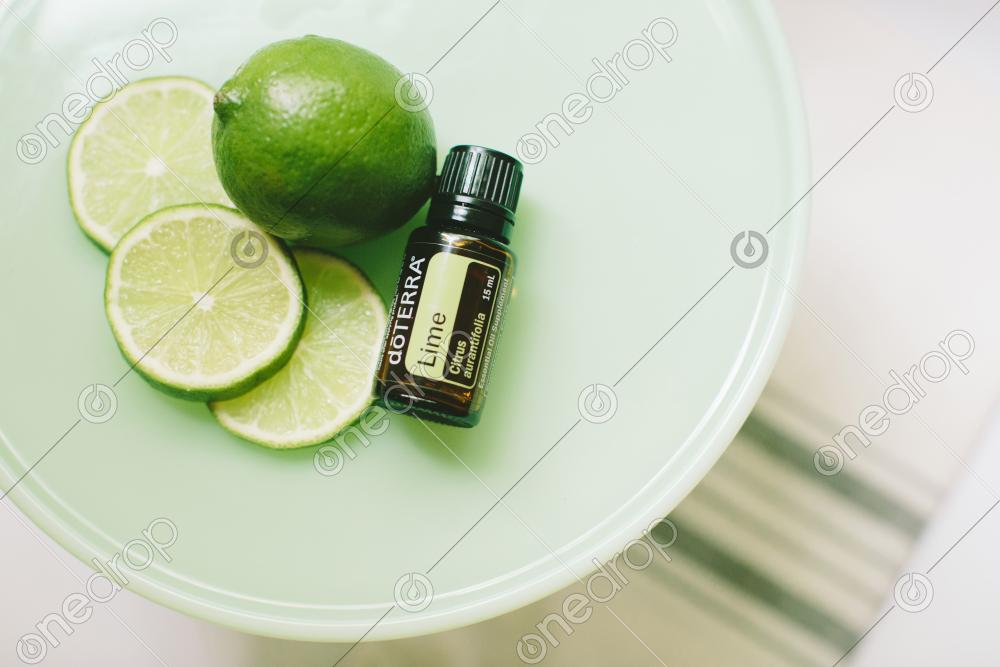 High-resolution photograph of Lime Essential Oil with fresh cut limes. Horizontal photograph with room for text if desired.