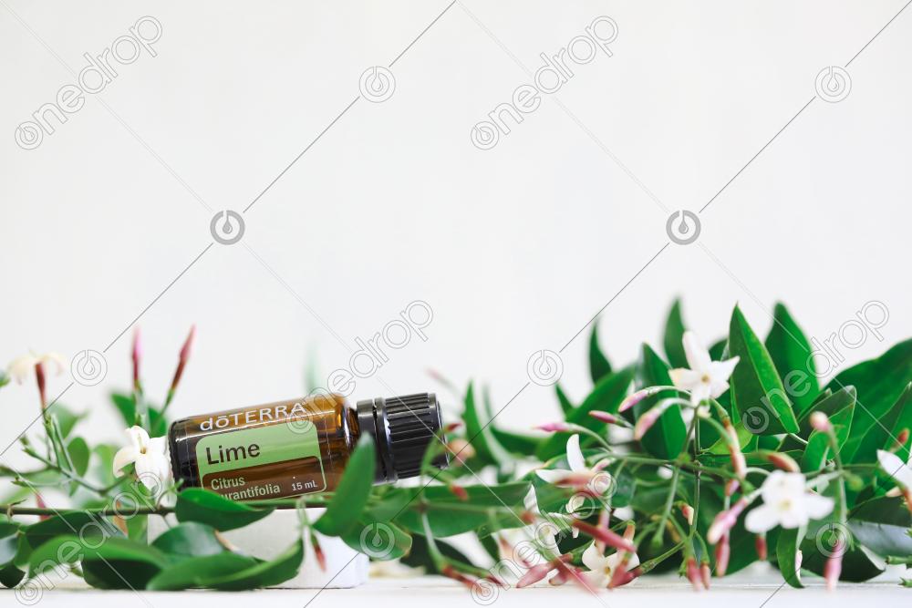Lime with fresh flowers on white background with copy space