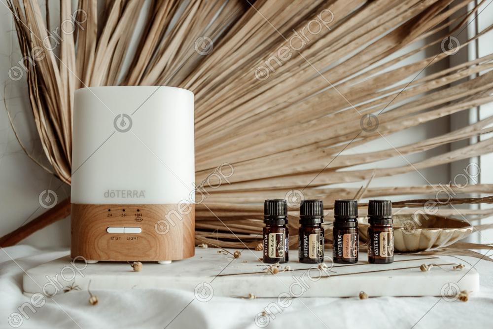 High Res image of Lumo Diffuser, Kumquat, Clementin, Yellow Mandarin & Red Manadarin standing on a marble board with dried palm leaf in background.