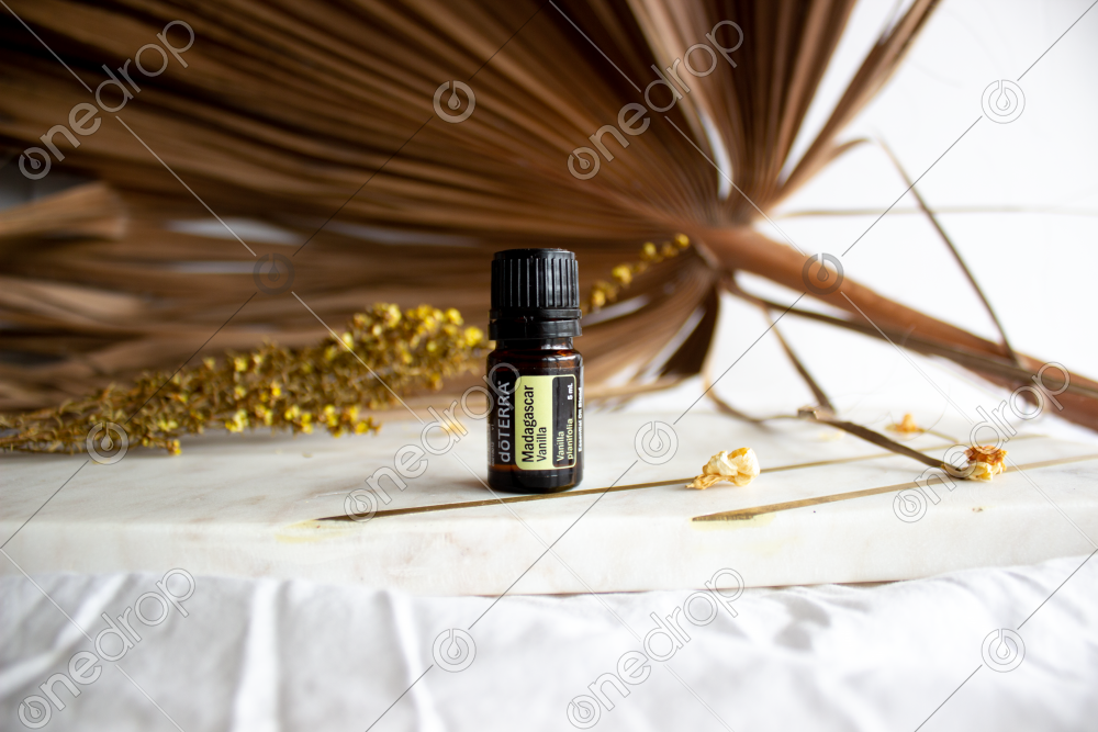 High Res image of Madagascar Vanilla 5ml standing on a marble board with dried palm leaf in background.