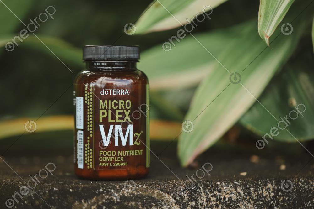 A high-res image of Microplex VMz Food Nutrient Complex in a natural setting with leafy background.