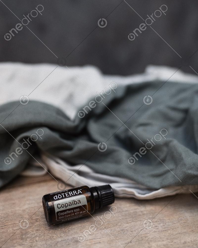 Minimalistic photo of Copaiba oil with green and white linen in the background.