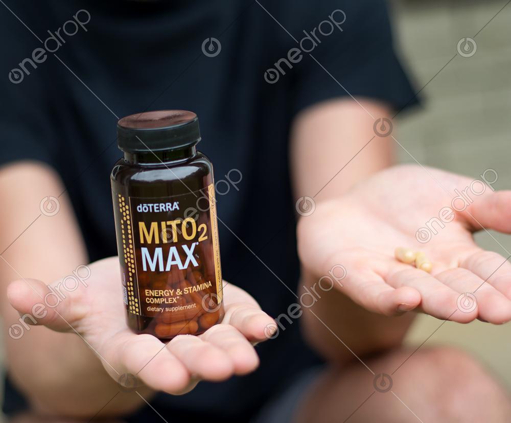 This high resolution photo bundle features Mito2Max® Energy & Stamina Complex bottle being held in one hand and capsule in the other by a young man. Sports themed photo.