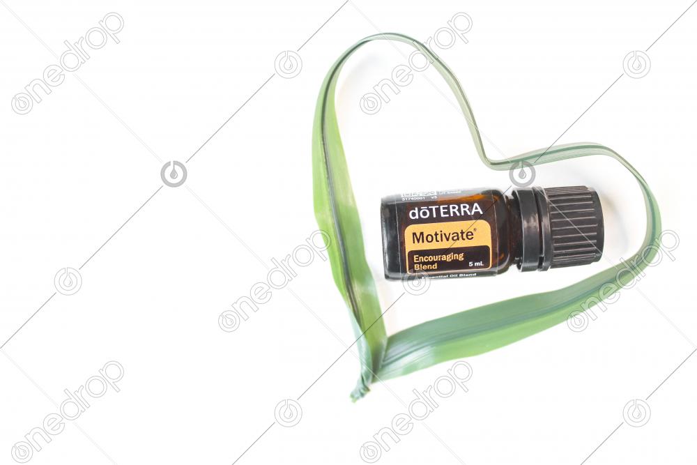 This high resolution image features a bottle of doTERRA Motivate® encouraging blend. It is placed within a heart formed from greenery. The background is bright white with space to personalize with your own text or logo.