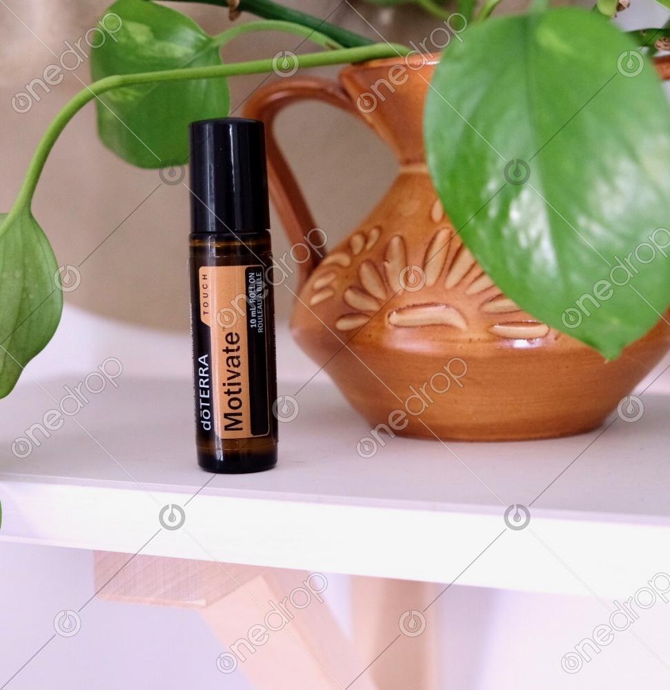 Motivate Touch Roller arranged on white shelf with plants and pottery.