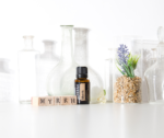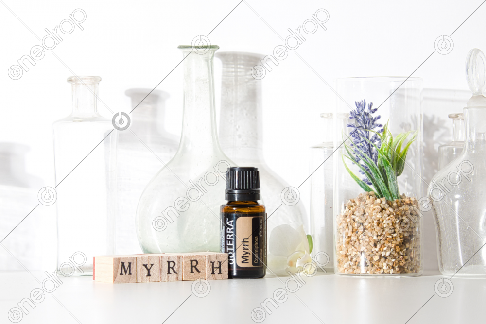 High-resolution image of dōTERRA Myrrh 15mL oil bottle on a white background and glass bottles