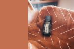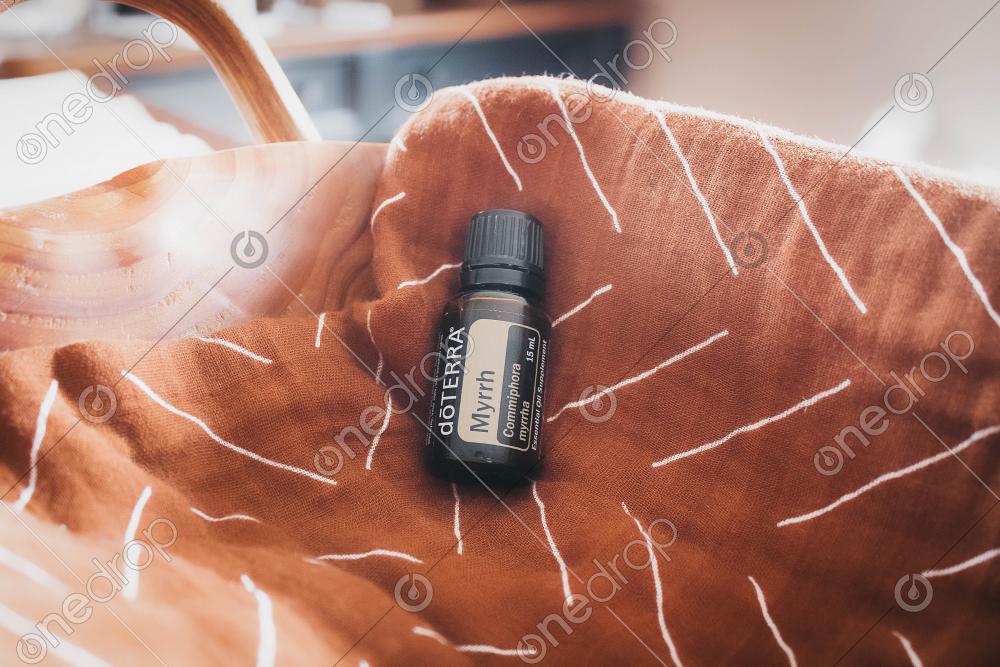 This photo features a 15 ml bottle of Myrrh on rustic mudcloth texture in wooden bowl