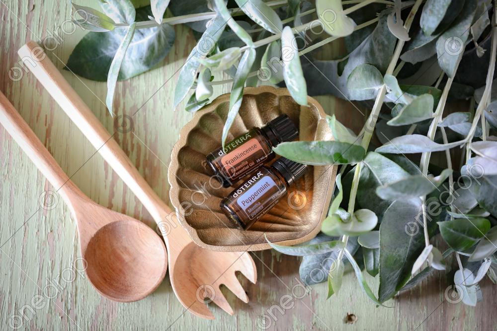 Natural flat lay image featuring dōTERRA Frankincense and dōTERRA Peppermint