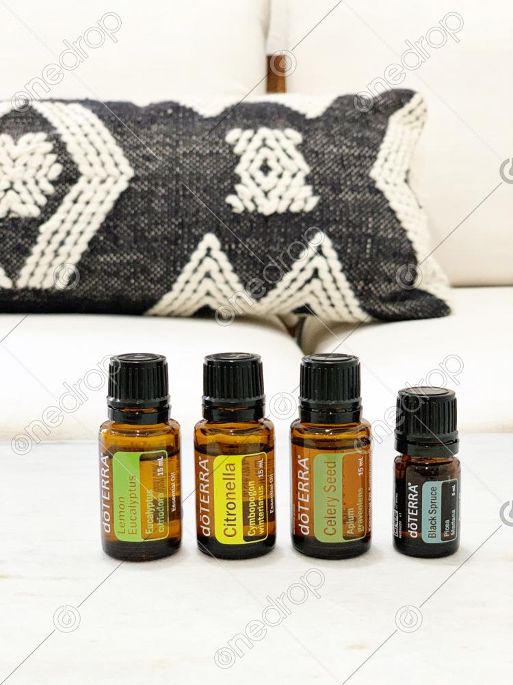 4 essential oils featured: Lemon/Eucalyptus, Citronella, Celery Seed & Black Spruce in a natural setting.