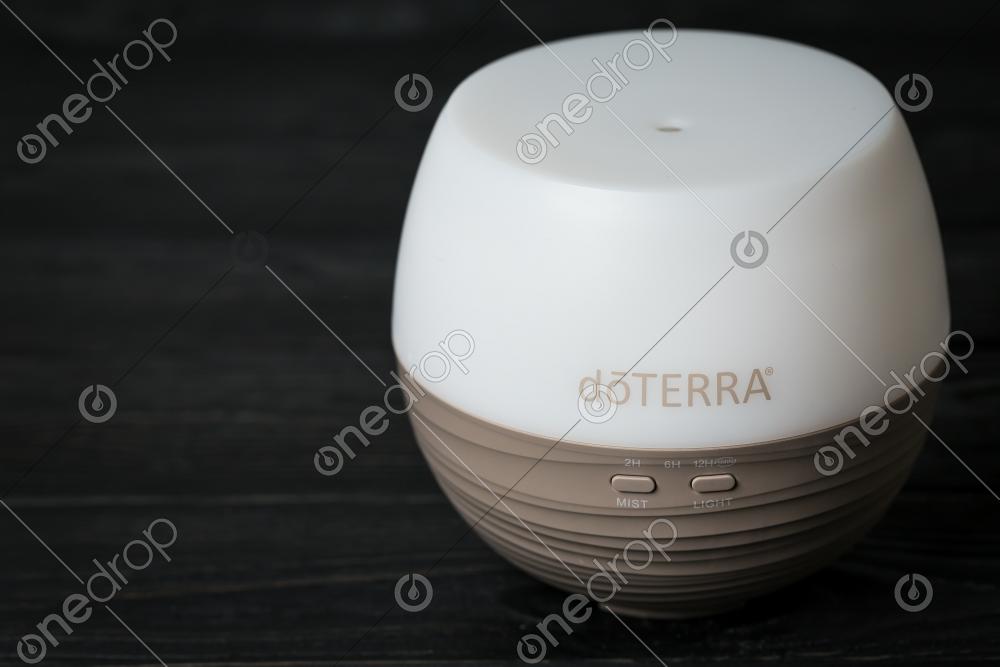 New Petal 2.0 diffuser on black wooden background, dark photo, copy space for text