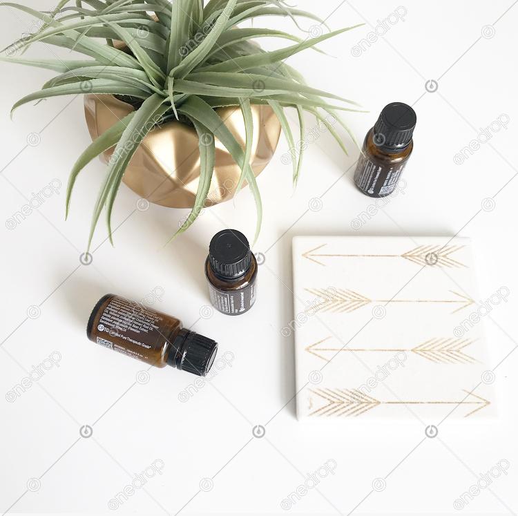 Simple, clean lifestyle photo of three oil bottles near pant in gold holder.
