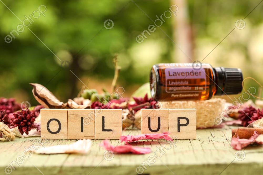 OIL UP text in wooden letters with Lavender oil in background surrounded by dried flowers