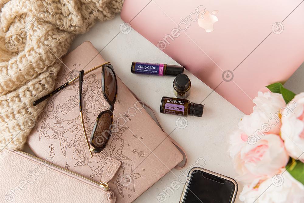 This image shows a 15ml bottle of Lavender and a 10ml Clary Calm roller in amongst a selection of items you might find in a home office - a diary, a rug, a laptop, a phone, sunglasses and some flowers.