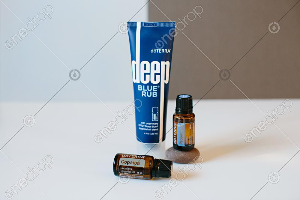 High-resolution photograph of Deep Blue, Copaiba, and Peppermint. Use this image to talk about the benefits of these products/oils for soothing temporary pain and discomfort! Horizontal photograph with room for text if desired.