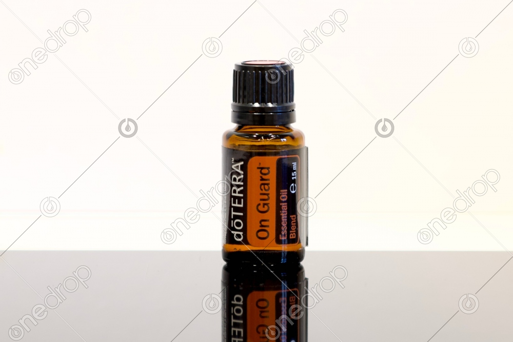 High-resolution photo with On Guard® 15mL oil bottle on a mirrored surface.