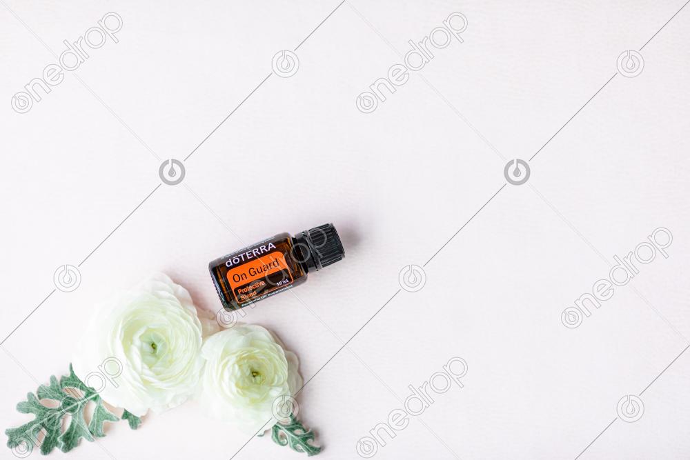 On Guard® 15 ml on pink background with white flowers and leaves. Blank space can be used to add text or high resolution image can be cropped creatively for Instagram, Facebook, or social media.