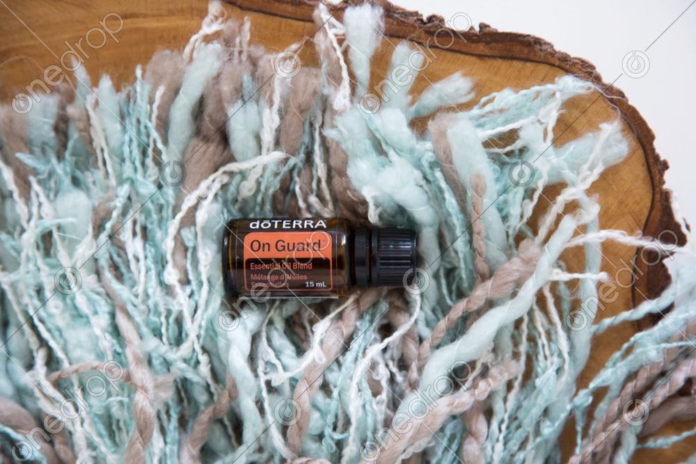 15 ml On Guard bottle on blue and brown blanket and in a wooden bowl.