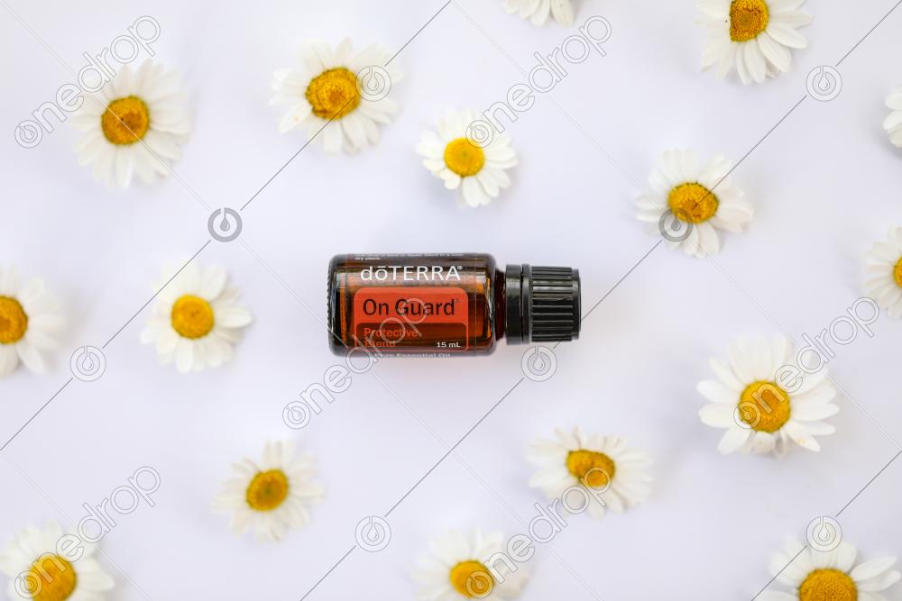 dōTERRA On Guard flat lay on white background surrounded by chrysanthemum flowers