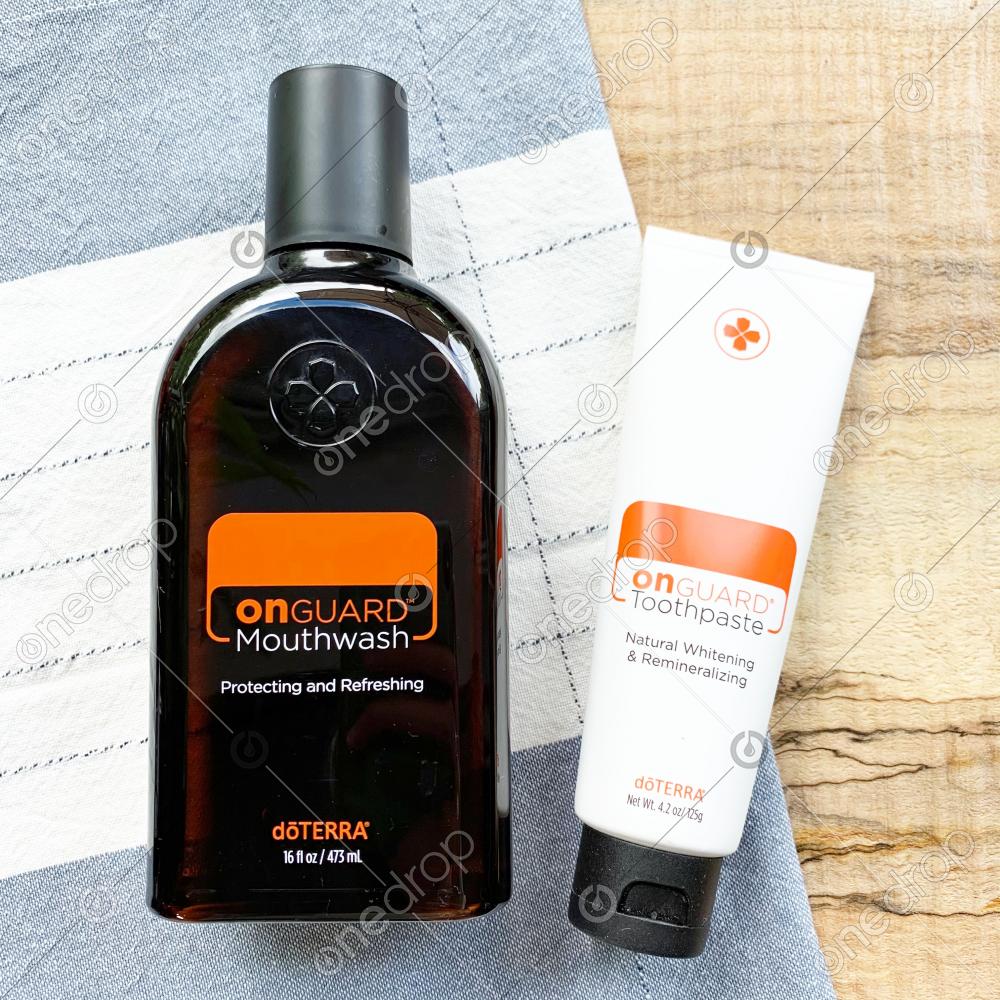 Features the On Guard Mouthwash & On Guard Toothpaste in a Flat Lay.