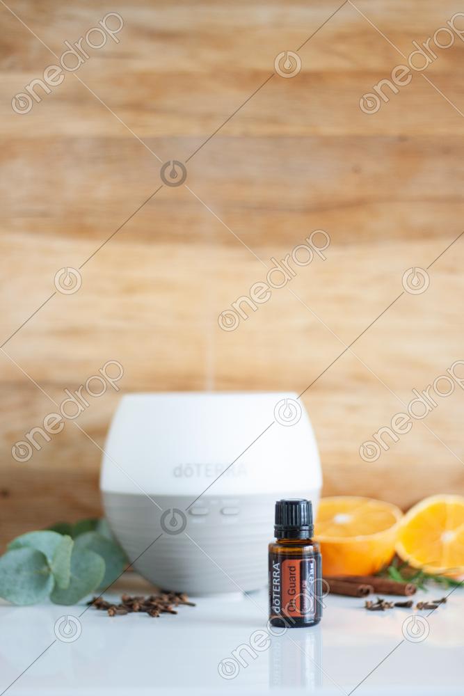dōTERRA On Guard Protective blend in front of diffuser Petal 2 vertical photos
