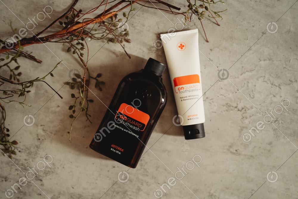 Warm, Earthy Styled Image: On Guard® Toothpaste & Mouthwash