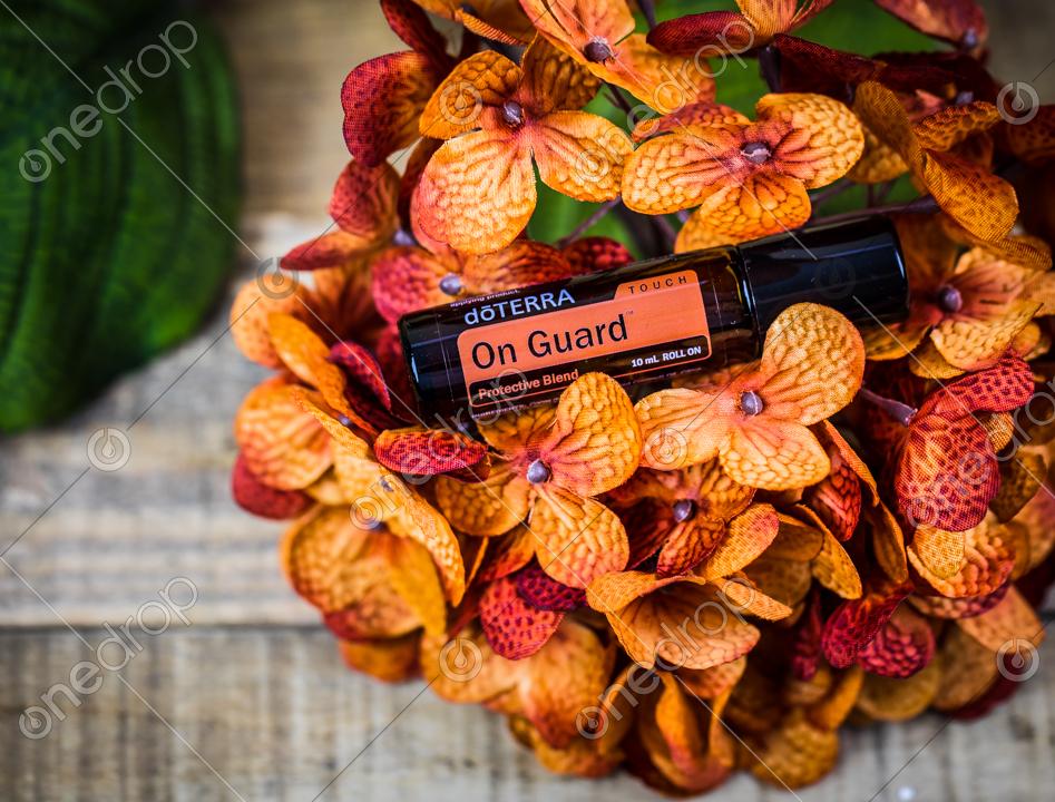 On Guard Touch oil with rustic wood and orange flowers.