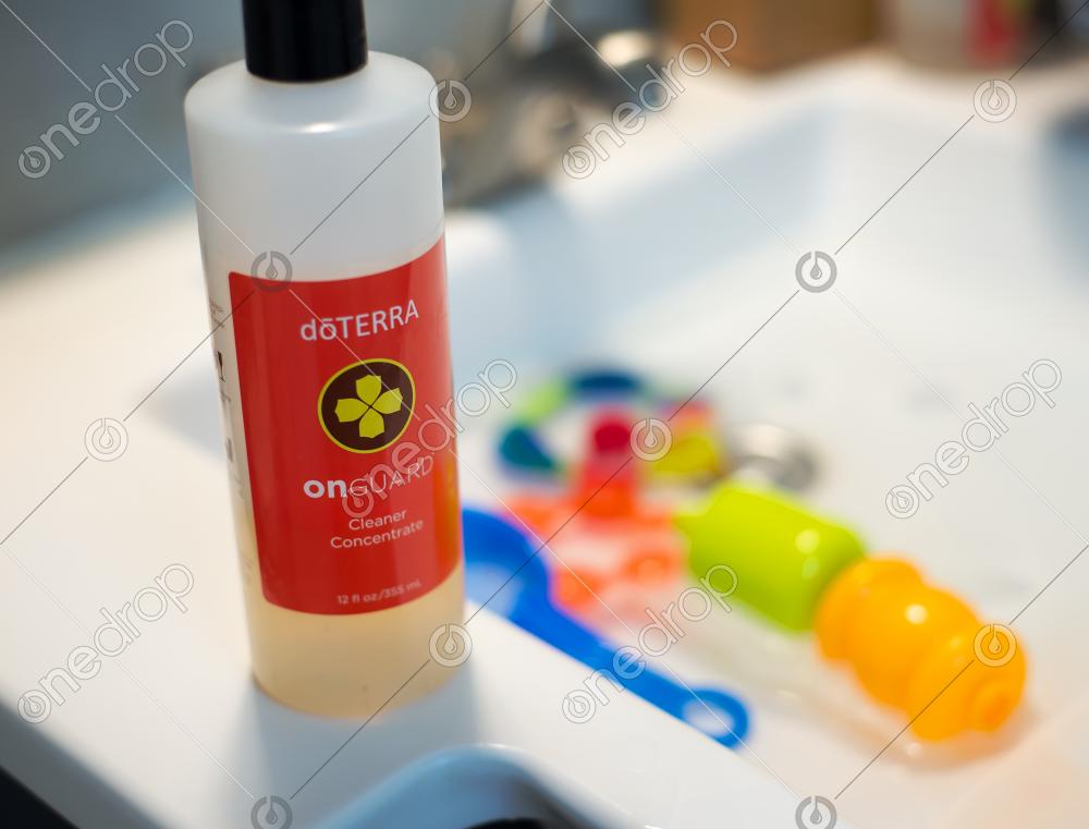 Images of dōTERRA Onguard® cleaner concentrate on the side of the sink with toys floating in water.