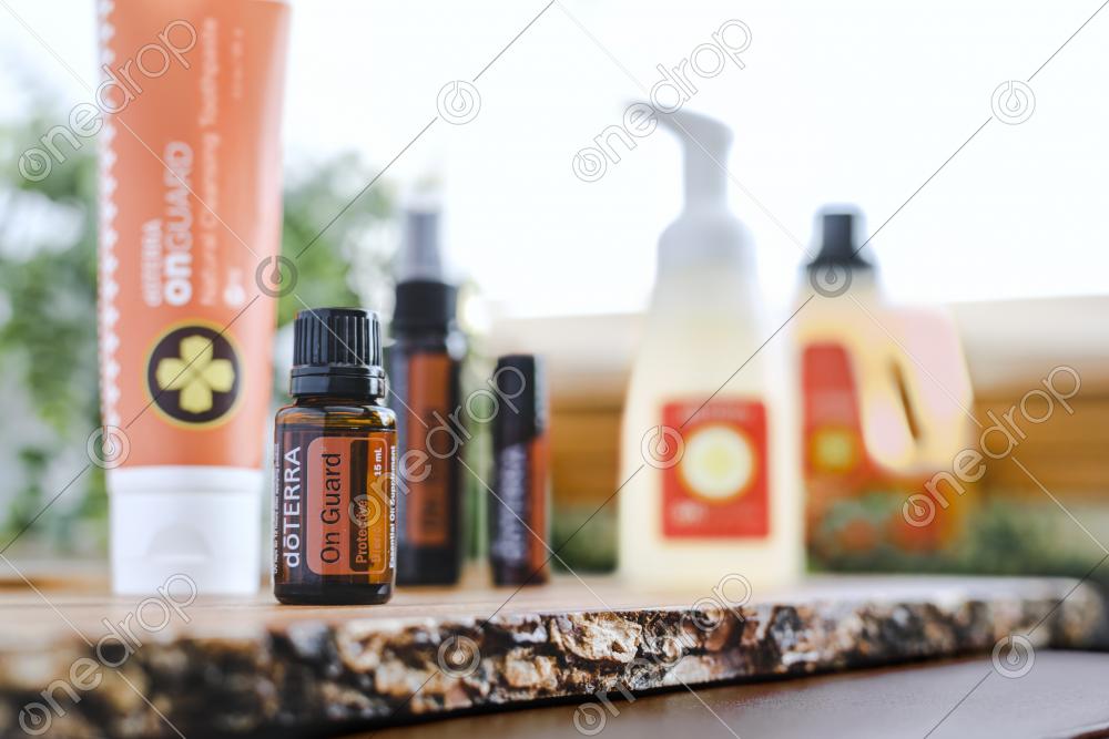 High-resolution image of popular dōTERRA On Guard® Products sitting on a table. Includes products that can replace common household products without the toxins and chemicals.