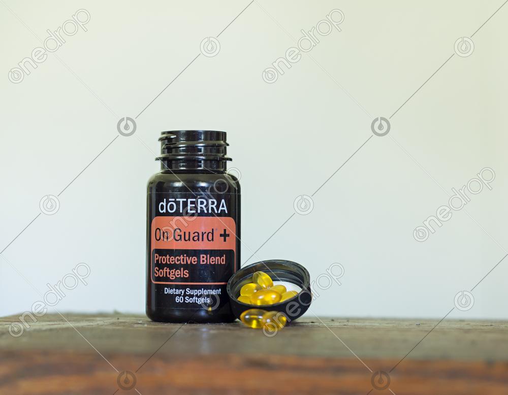 This high resolution photo features dōTERRA On Guard®+ Softgels on wood with a white background. Highlighting the capsules displayed beside bottle.