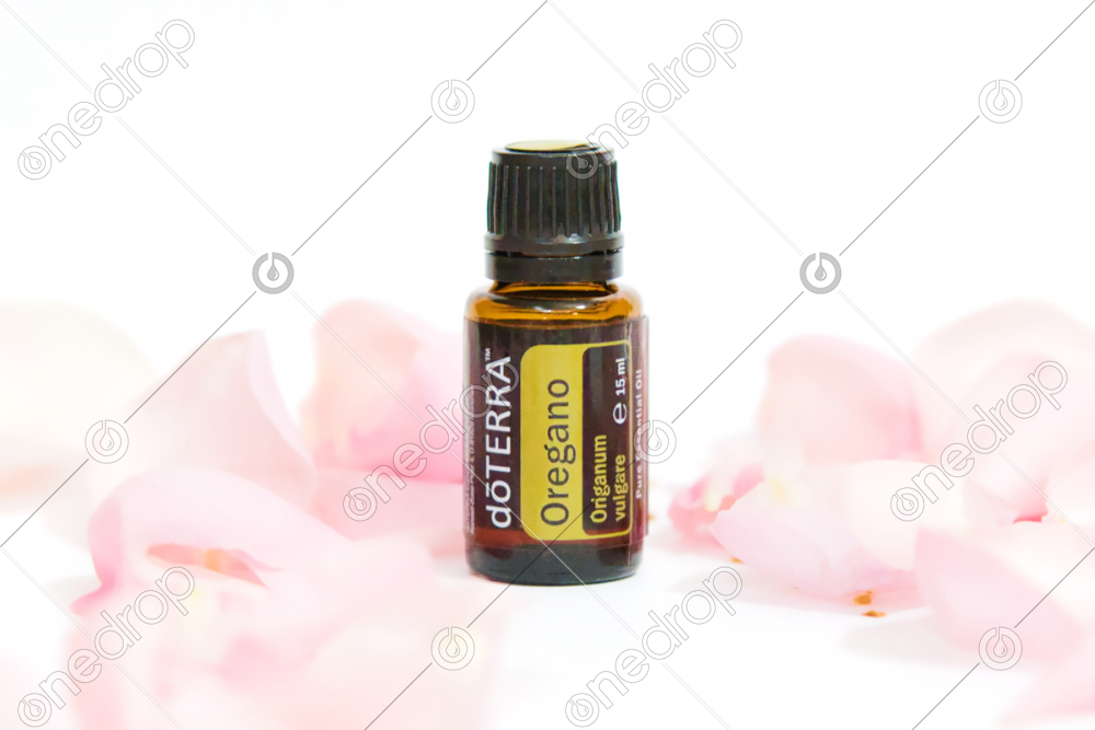 High-resolution photo with Oregano 15mL oil bottle on a a background of rose petals