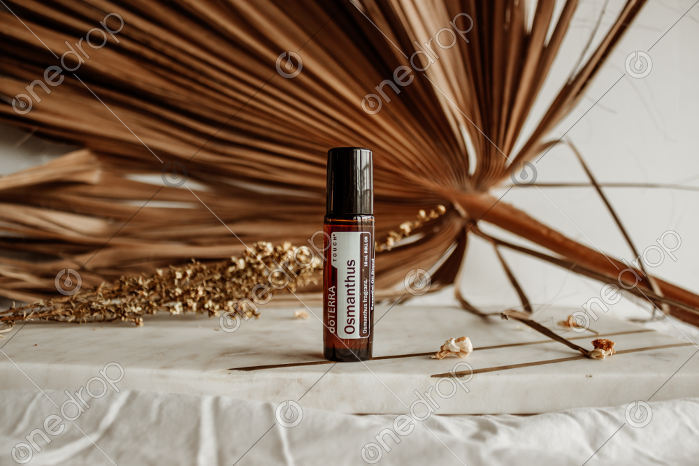 High Res image of Osmanthus Touch standing on a marble board with dried palm leaf in background.