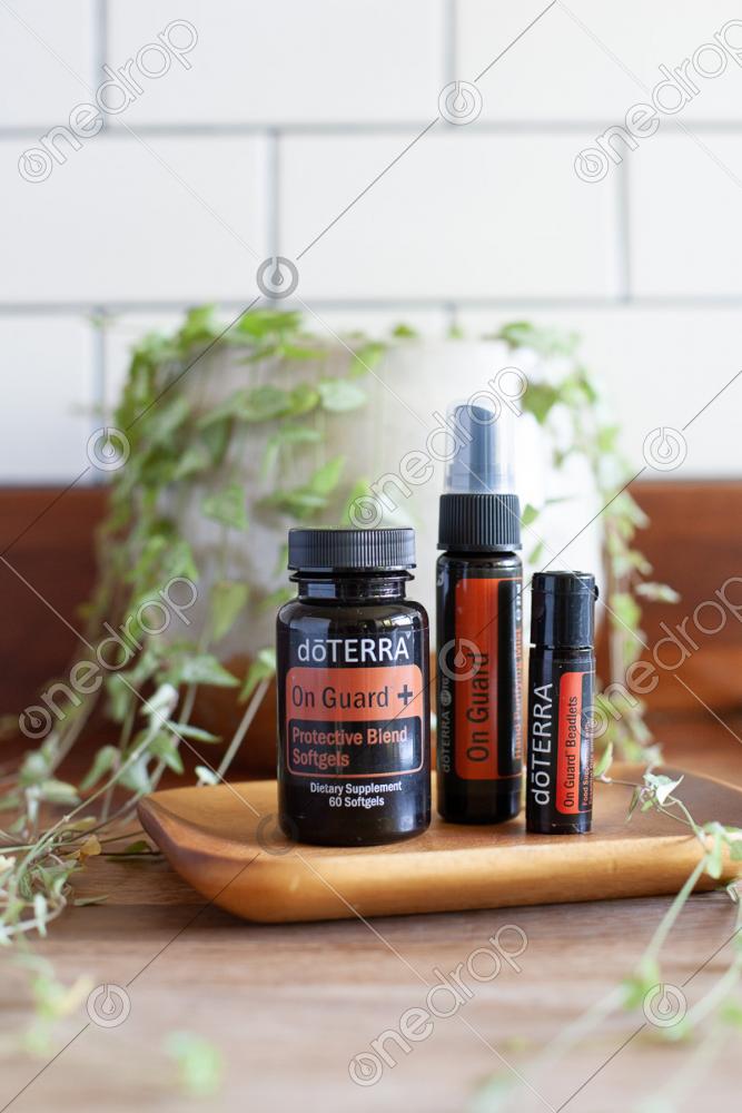 On Guard sanitizing mist, protective blend softgels and beadlets displayed in kitchen with plant.
