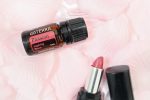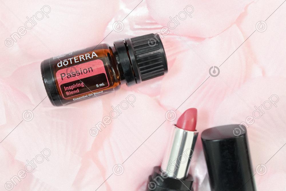 This high-resolution image features dōTERRA's Passion® blend with lipstick on a bed of pink rose petals.