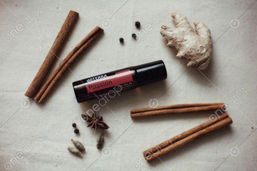 This image features the 10ml Passion Blend Touch roller bottle, atop a light coloured fabric texture with cinnamon, ginger and spices around. Use this image to share your favourite uses!