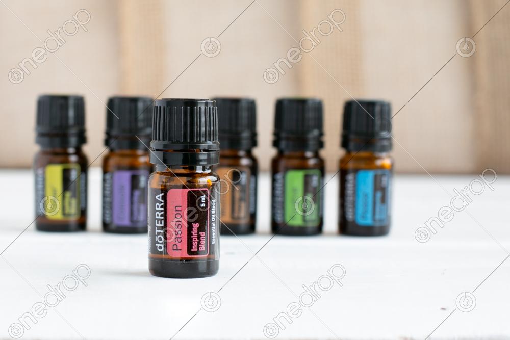 Image of dōTERRA Passion with all emotional aromatherapy kit oils in the background on white wood with burlap.