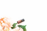 Small passion essential oil bottle on a white background with pink hydrangea flowers and room for copy. Blank space can be used to add text or high resolution image can be cropped creatively for Instagram, Facebook, or social media.