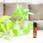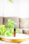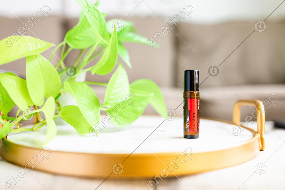 Passion® Touch 10 ml on a white marble tray with plant leaves. Blank space can be used to add text or high resolution image can be cropped creatively for Instagram, Facebook, or social media.