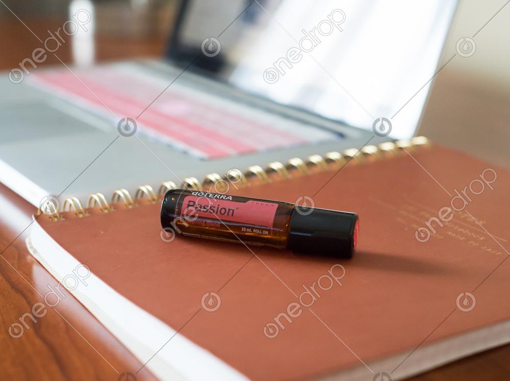 High resolution images of dōTERRA Passion® touch roller bottle in work spaces.