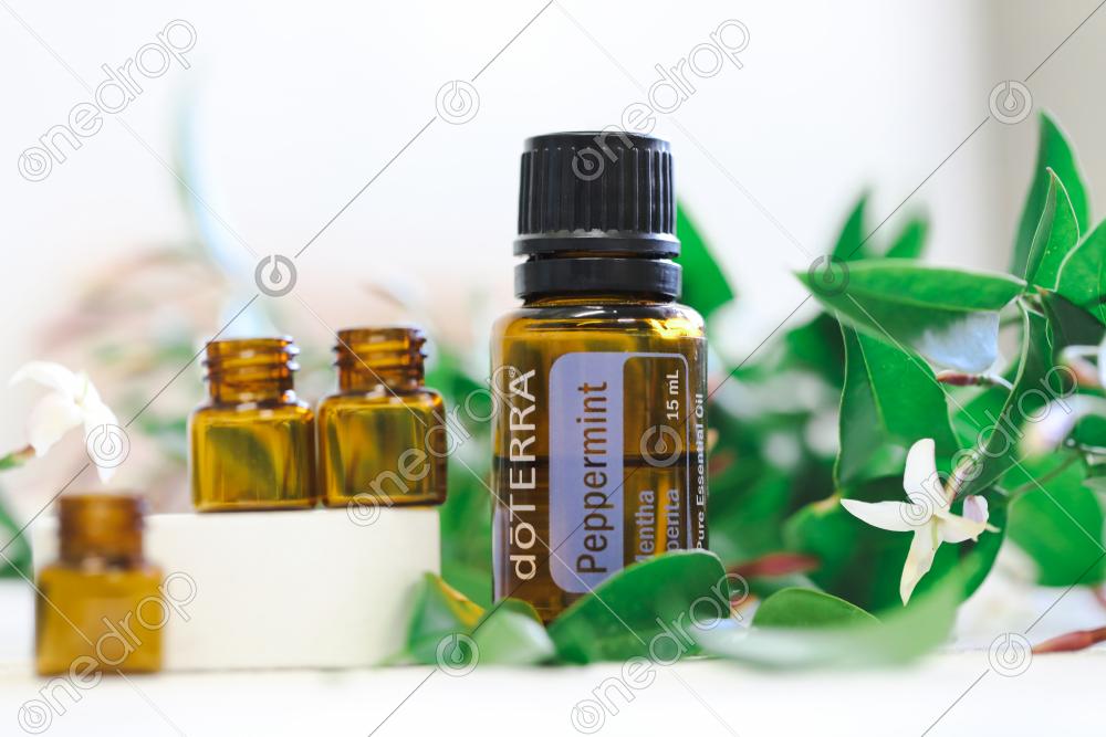 dōTERRA Peppermint with sample drams and fresh flowers