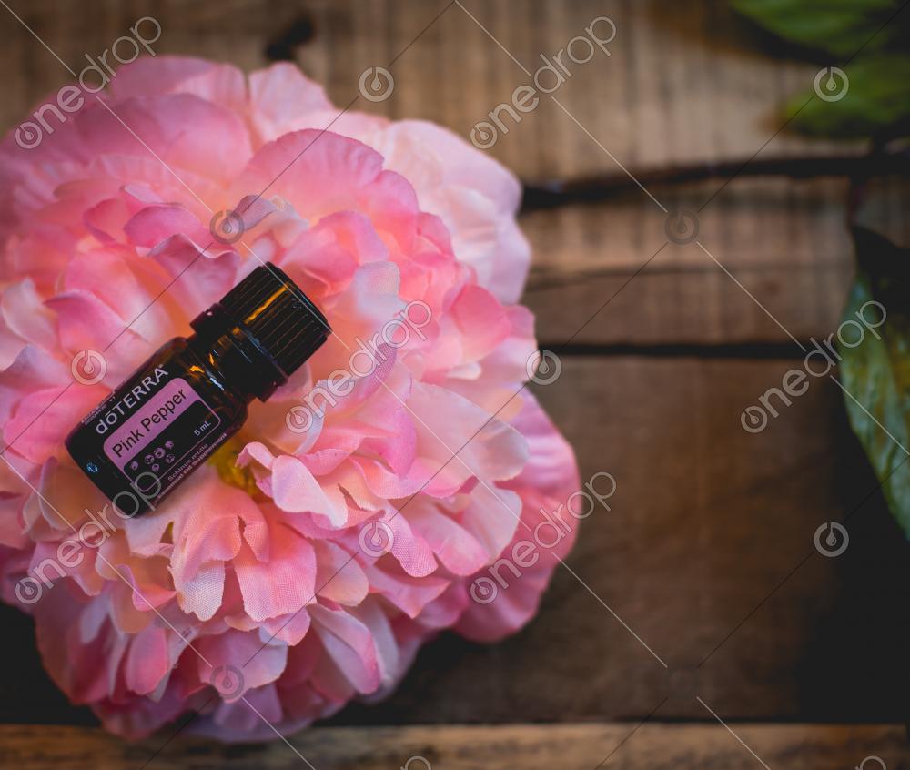 High Resolution image of Pink Pepper oil on a pink flower with greenery and rustic wood.