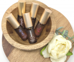 - Image of oils in wooden bowl, white rose and the collection box in background.
