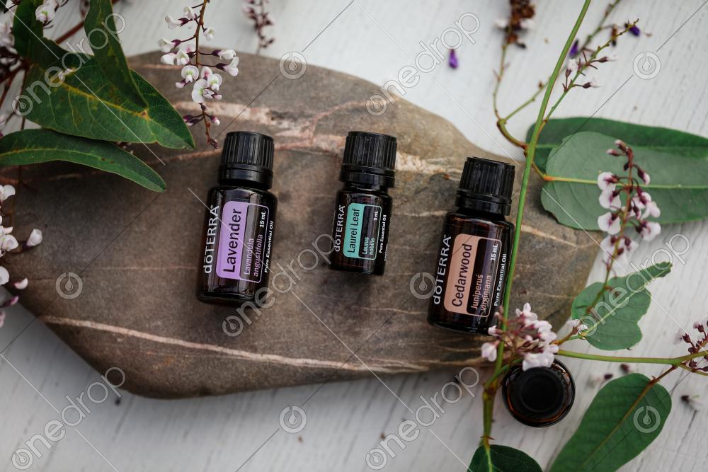Pretty flat lay image featuring dōTERRA Lavender, Cedarwood and Laurel Leaf with fresh flowers