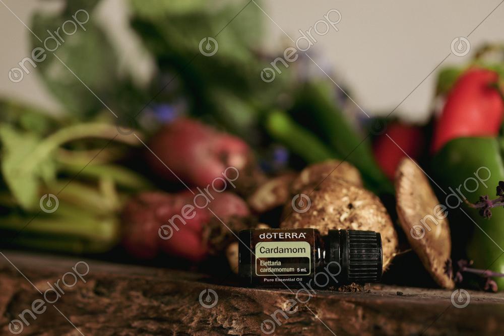 Product image featuring Cardamom in kitchen setting with collection of home grown vegetables
